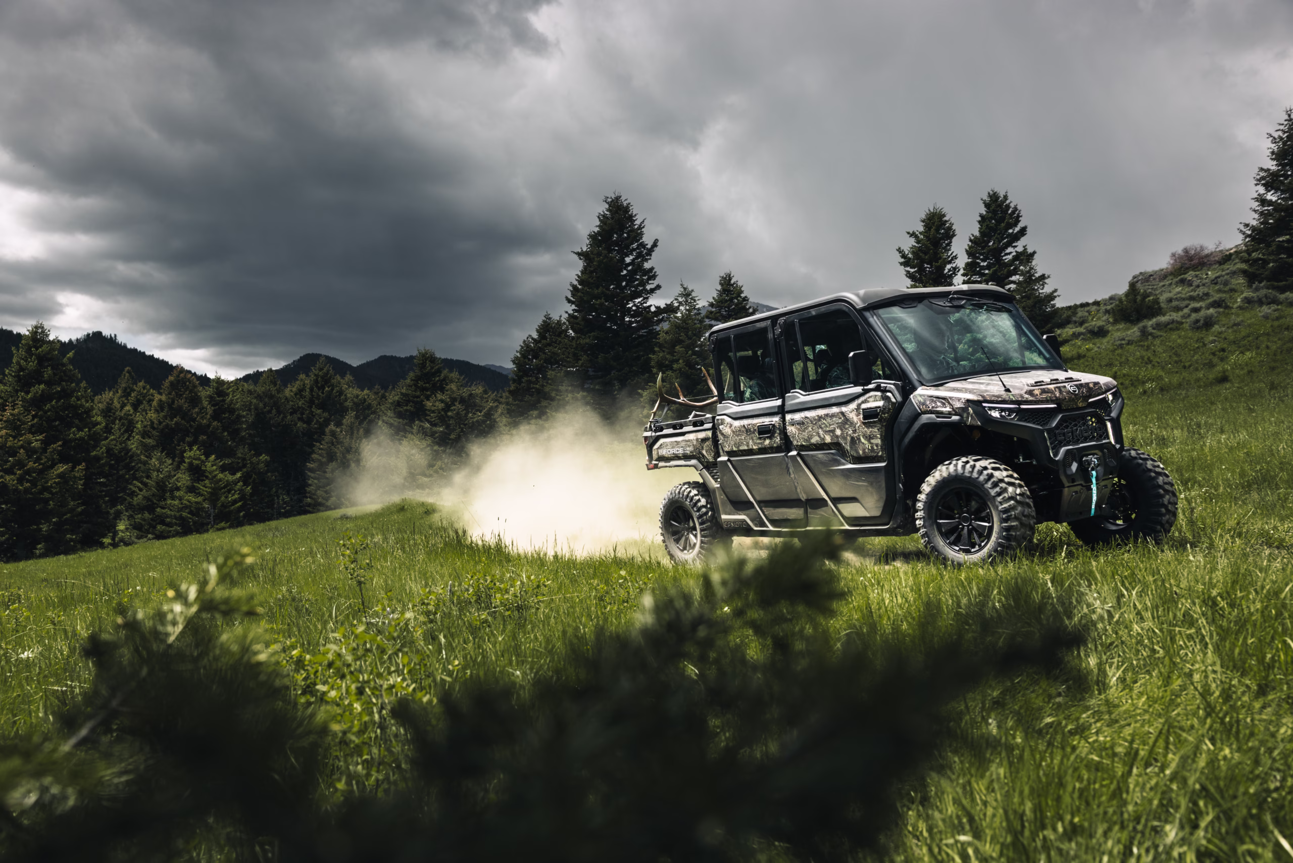 The 2026 CFMOTO UFORCE U10 XL Pro Highland elevates the UTV experience with a fully enclosed, climate-controlled cab thatโs factory-installed and built to handle all seasons. The sealed cabin keeps dust, noise, and weather out while providing heating, cooling, and ventilation for year-round comfort. Power glass windows, a tilt windshield with wiper, and a sliding rear window make it easy to adapt airflow as conditions change. Inside, two full bench seats accommodate six passengers, with premium upholstery, sound-deadening insulation, and smart storage under the seats. LED lighting throughout the cabin and exterior provides excellent visibility, while the exterior is protected by skid plates, full doors, and sturdy body panels finished in CFMOTOโs premium paint schemes.